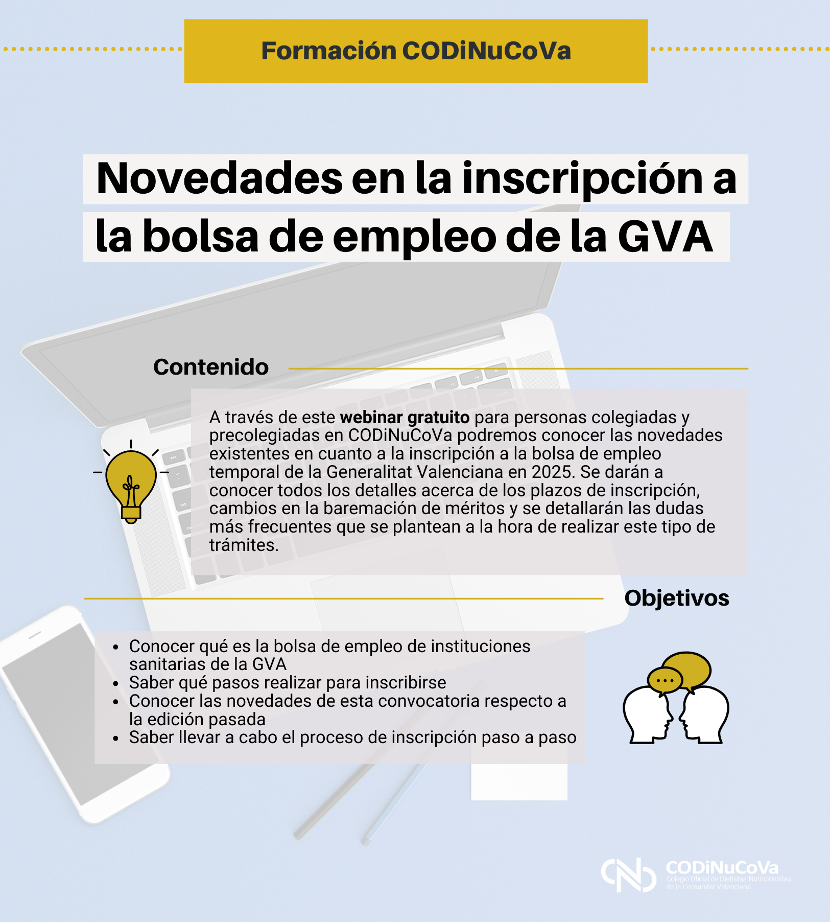 A través de este webinar gratuito para personas colegiadas y precolegiadas en CODiNuCoVa podremos conocer las novedades existentes en cuanto a la inscripción a la bolsa de empleo temporal de la Generalitat Valenciana en 2025. Se darán a conocer todos los detalles acerca de los plazos de inscripción, cambios en la baremación de méritos y se detallarán las dudas más frecuentes que se plantean a la hora de realizar este tipo de trámites.