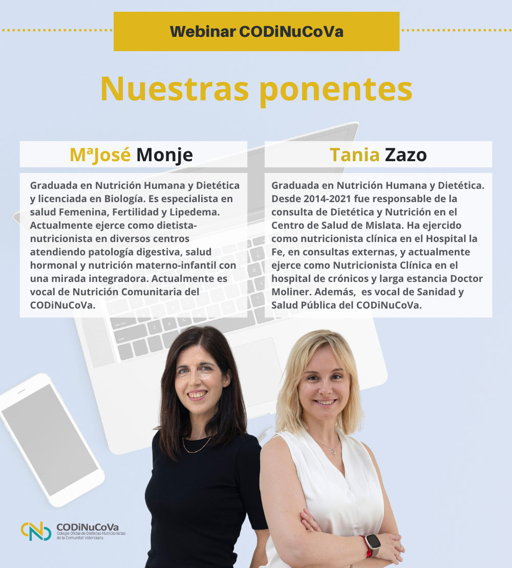 Mª José Monje:Graduada en Nutrición Humana y Dietética y licenciada en Biología. Es especialista en salud Femenina, Fertilidad y Lipedema. Actualmente ejerce como dietista-nutricionista en diversos centros atendiendo patología digestiva, salud hormonal y nutrición materno-infantil con una mirada integradora. Actualmente es vocal de Nutrición Comunitaria del CODiNuCoVa.