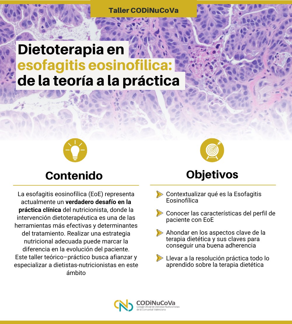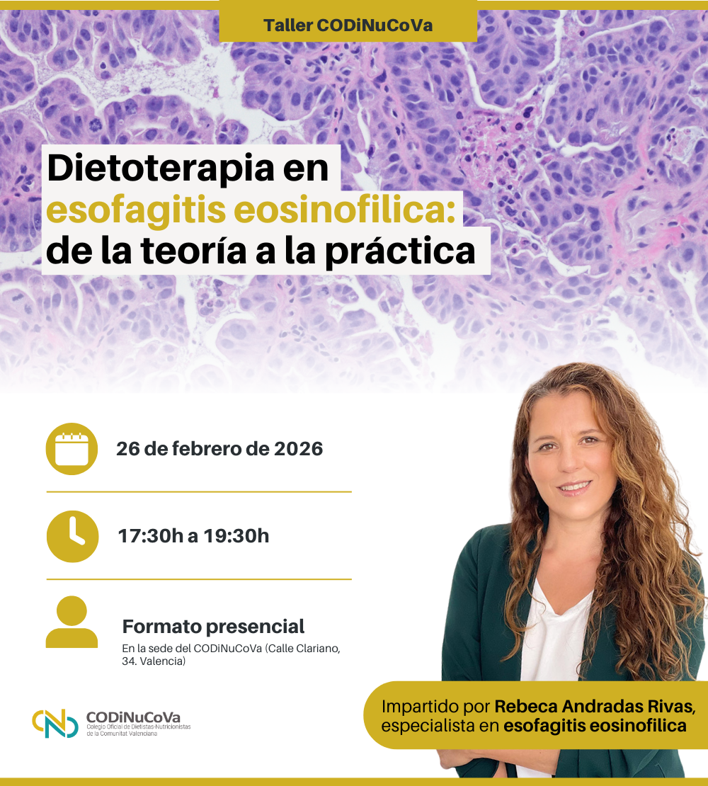 Arrancamos el plan formativo de CODiNuCoVa para 2026 con este taller presencial sobre esofagitis eosinofílica (EoE), una enfermedad inflamatoria crónica del esófago, generalmente relacionada con alergias o reacciones a determinados alimentos. Provoca síntomas como dificultad para tragar, sensación de atasco al comer o dolor, y su abordaje representa actualmente un verdadero desafío en la práctica clínica del nutricionista.