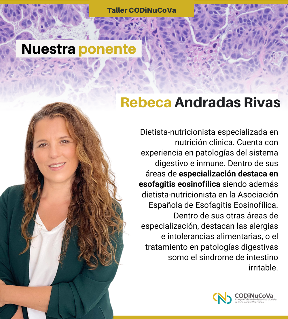 Rebeca Andradas Rivas: Dietista-nutricionista especializada en nutrición clínica. Cuenta con experiencia en patologías del sistema digestivo e inmune. Dentro de sus áreas de especialización destaca en esofagitis eosinofílica siendo además dietista-nutricionista en la Asociación Española de Esofagitis Eosinofílica. Dentro de sus otras áreas de especialización, destacan las alergias e intolerancias alimentarias, o el tratamiento en patologías digestivas somo el síndrome de intestino irritable